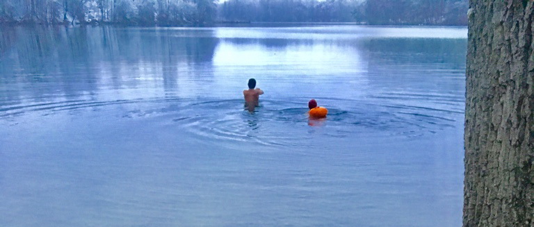 Auch wenn die frisch verschneite Landschaft nur 6,8 Grad Celsius anzeigt und das Wasser ziemlich erfrischend ausschaut, wagen sich doch immer wieder Leute zu einem kurzen Bad in den schön gelegenen See. Unsere aktuellen Aufnahmen entstanden als zwei junge Leute das Kühl des Sees genossen.