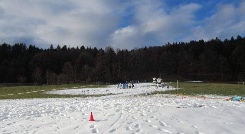 Erste Hilfe – Hilfestellung für den Winter gibt es am Skilift in Sachrang. Wenn der Winter noch nicht so recht in die Spur kommen will, muss man ihm halt ein bissel unter die Arme greifen. So entstand auf der grünen Wiese der farbliche Dreiklang blau, grün und weiß.