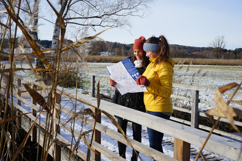 Der Atem gefriert in der Luft, und vor einem bereitet sich die verschneite Voralpenlandschaft aus. Am Horizont ragen die weißen Gipfel der Chiemgauer Alpen und des Mangfallgebirges in die Höhe und zeichnen sich gegen einen eisblauen Himmel ab. In der ruhigeren Jahreszeit können die Gäste die Region in ihrem eigenen Rhythmus entdecken – aktiv beim Wintersport, entspannt beim Wellnessen, oder wissbegierig bei speziellen Winterthemenführungen. Ständiger Begleiter ist die neue Winterkarte.