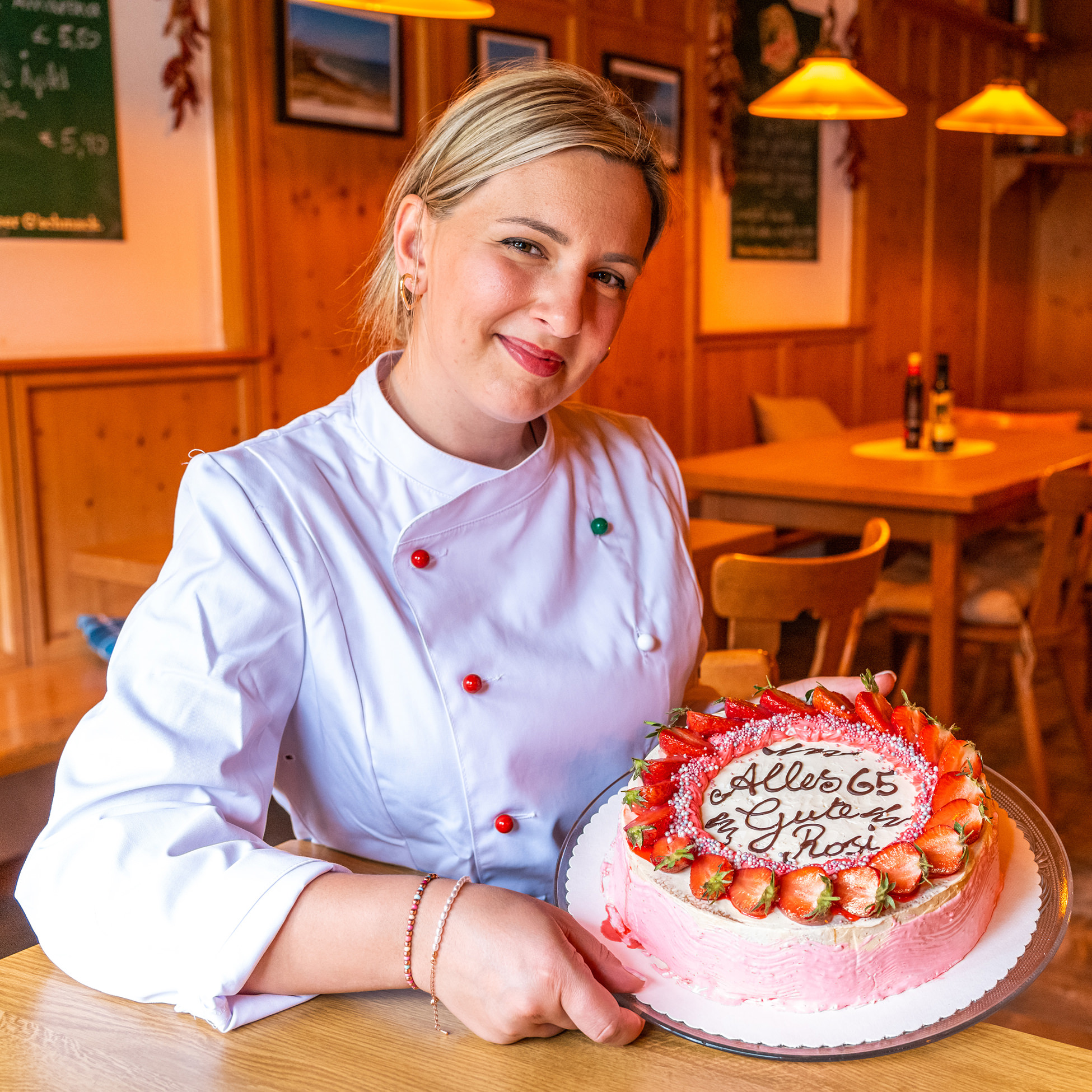 Confiseurin Francesca Démanuele aus Achenmühle zeigt die Geburtstagstorte.