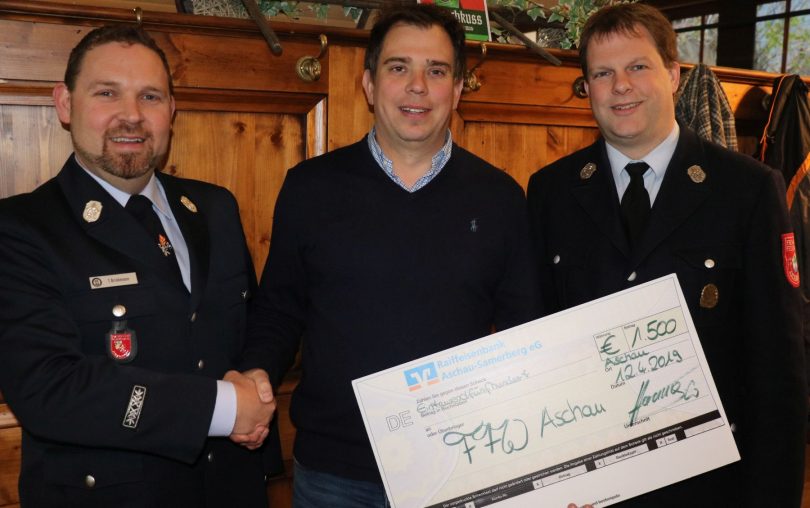 Bericht und Foto: Heinrich Rehberg – Bildunterschrift: Der Kommandant der Aschauer Feuerwehr Tobias Brinkmann (links) und der Vorsitzende Werner Grill (rechts) freuen sich über 1500 Euro aus der Hand von Werner Heinrichsberger junior.