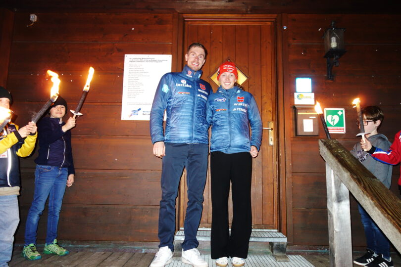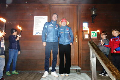 Bericht und Bilder: Sepp Hauser – Durch ein Spalier der fackeltragenden WSV-Jugend gingen Johannes Kühn und Trine Göpfert ins Zielhäusl im Langlaufstadion, wo die Ehrung stattfand.