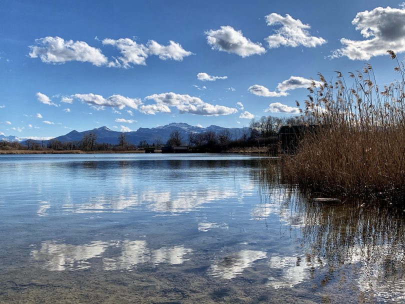 Die Weite des Himmels, die sich im kristallklaren See spiegelt und dazu die unberührte Welt der schneebedeckten Berge, schöner geht es nicht. Die traumhafte Kulisse vom bayerischen Meer und dazu im Hintergrund das Kampenwand-Massiv ziehen seit Urzeiten die Menschen in ihren Bann. Selbst wer glaubt, dass nichts für die Ewigkeit bleibt, dürfte in mitten dieser Bilderbuch-Landschaft einen Hauch von Ergebenheit erhaschen. Wie hier in der Schafwaschener Bucht gab es am vergangenen Wochenende einen traumhaften Augenblick, als das Sonnenlicht die weißen Wolken in der Wasseroberfläche wiederspiegelte. An so einem Moment wird einem mehr denn je bewusst, was es für ein Geschenk ist, dass wir in solch einer kostbaren Landschaft leben dürfen.