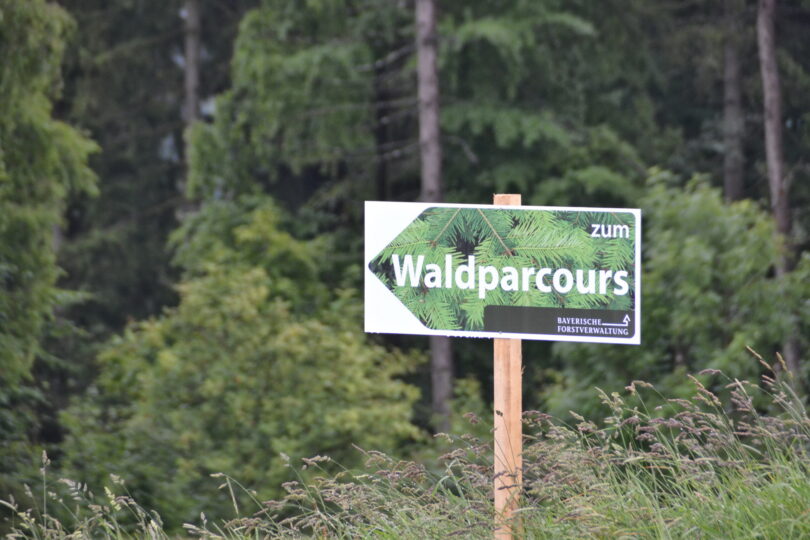 Foto: Gregor Schiessl – Wegweiser in den Wald zu einem Waldparcours