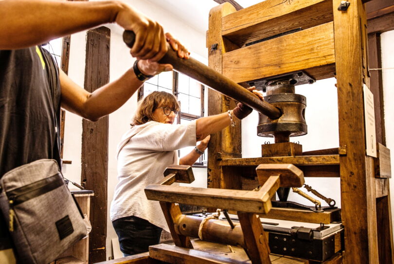 Bericht: Stadt Nürnberg – Bild: hochdruckpresse_oliver_frank.jpg – BU: Sofia Fränkl und ein Besucher an der Hochdruckpresse – Foto: Oliver Frank