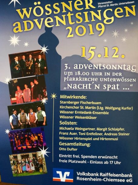 Als Erbe von Pfarrer Niegel übernommen, hat sich das Wössner Adventsingen zu einer Veranstaltung mit enormer Strahlkraft und entsprechendem Zulauf aus nah und fern entwickelt. Auch heuer findet das Adventssingen statt und zwar am 3. Adventssonntag, den 15. Dezember 2019, um 18 Uhr in der Pfarrkirche Unterwössen. Einlass ist ab 17 Uhr.