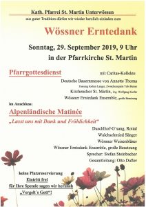 Die Katholische Pfarrei St. Martin Unterwössen lädt am Sonntag, den 29. September 2019, um 9 Uhr in die Pfarrkirche zum Wössner Erntedank. Der Pfarrgottesdienst wird vom Kirchenchor St. Martin und dem Wössner Erntedank Ensemble musikalisch umrahmt, unter anderem mit der Deutschen Bauernmesse von Annette Thoma.