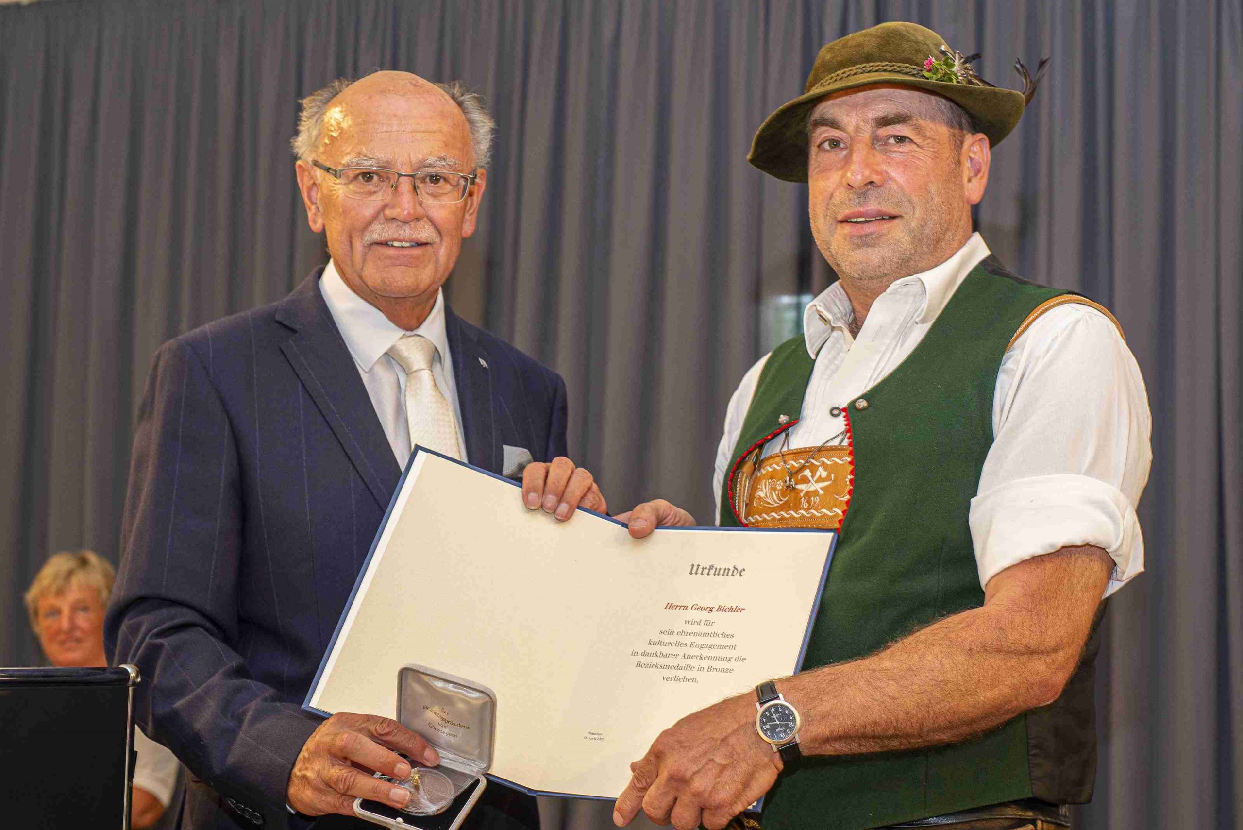 Bezirkstagspräsident Josef Mederer (links) überreichte die Bezirksmedaille an Georg Bichler.