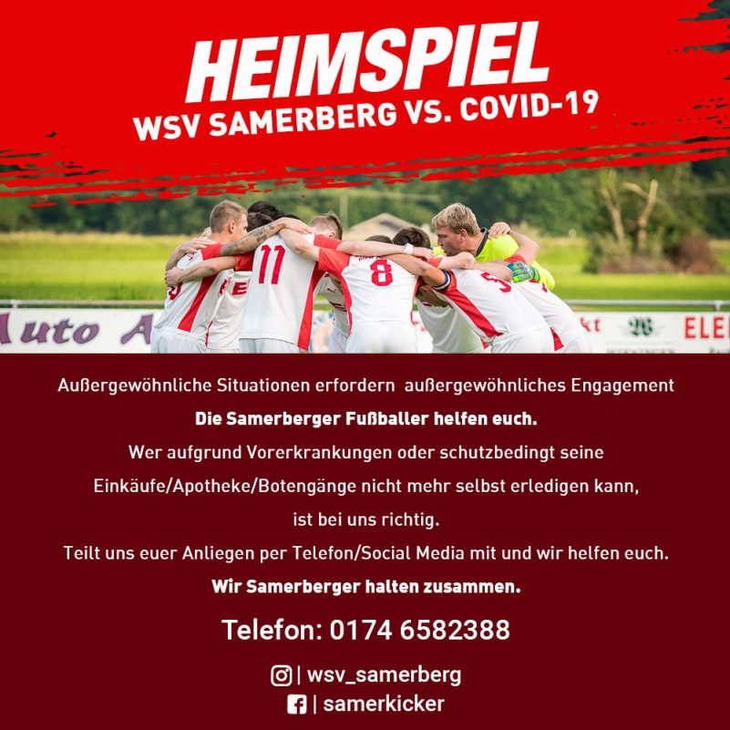 “Aussergewöhnliche Situationen erfordern aussergewöhnliches Engagement” – mit diesem Satz beginnt die Bekanntgabe der Fußballer des des Wintersportvereins Samerberg zum Spiel “WSV Samerberg gegen COVID-19”. Und weiter heißt es: “Die Samerberger Fußballer helfen Euch. Wer aufgrund von Vorerkrankungen oder schutzbedingt seine Einkäufe (inkl. Apotheke) der Botengänge nicht mehr selbst erledigen kann, der ist bei uns richtig. Teilt uns Euer Anliegen per Telefon oder Social Media mit und wir helfen Euch. Die Samerberger halten zusammen”. Folgende Kontakte stehen zur Verfügung: Telefon 0174-6582388, Internet: www.wsv-samerberg.de sowie Facebook: samerkicker.