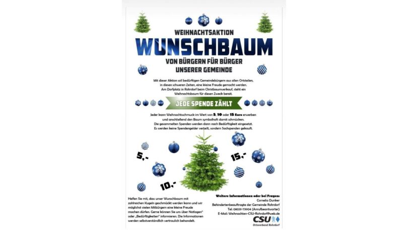 Der CSU-Ortsverband Rohrdorf wünscht den Bürgerinnen und Bürgern der Gemeinde eine gesegnete Adventszeit und ein friedliches Weihnachtsfest. Wie auch in den letzten Jahren möchten der CSU-Orstverband mit der Weihnachtsaktion „Wunschbaum“ beim Christbaumverkauf Unterseher am Dorfplatz in Rohrdorf allen Bürgern die Gelegenheit geben, bedürftigen Mitbürgern in der Gemeinde eine kleine Freude zu bereiten. Mit den Weihnachtskugeln, die in verschiedenen Größen zu je 5, 10 oder 15 Euro gekauft werden können, wird der Weihnachtsbaum dekoriert. Am 4. Adventssonntag erfolgt dann die Versteigerung des mit einer Lichterkette versehenen Christbaumes. Gebote dazu können beim Christbaumverkauf Unterseher abgegeben werden.