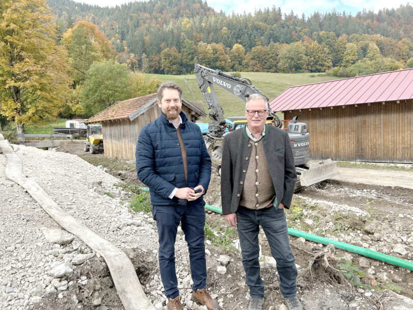 Bericht und Bild: Gemeinde Unterwössen – Erster Bürgermeister Ludwig Entfellner (rechts im Bild) und Zweiter Bürgermeister Johannes Weber machen sich vor Ort ein Bild über die derzeit laufenden Maßnahmen des Wasserwirtschaftsamtes Traunstein in Hinterwössen.