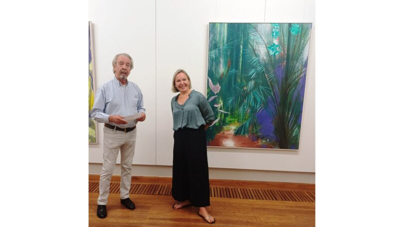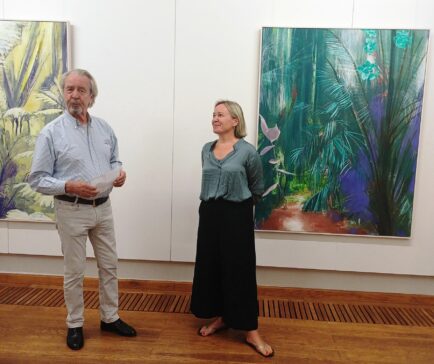 Bei der Vernissage führte Kurator Rudolph Distler ein Gespräch mit Yvette Kießling vor zwei ihrer Gemälde aus dem Regenwald (ausführlicher Bericht folgt).