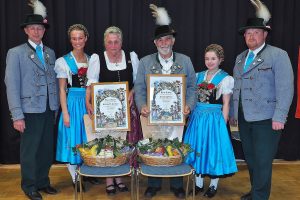 Ernennung Elisabeth Lankes und Franz Eglseer zu Ehrenmitgliedern. (von links) 2. Vorstand Bernhard Schützinger, Aktivendirndl Stephanie Hainz, Ehrenmitglied Elisabeth Lankes, Ehrenmitglied Franz Eglseer, Aktivendirndl Maria Wimmer und Vorstand Stefan Lohwieser.