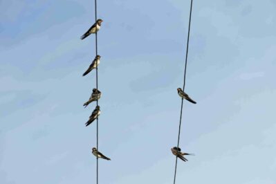 Hier pfeifen nicht die Spatzen von den Dächern sondern es zwitschern die Schwalben von den Kabeln. In Aschau i.Chiemgau haben sich in der Abendstunde die Vögel zu einem „Ratsch zum Tagesabschluss“ zusammen gefunden, getreu dem Motto „zammhocka“ – nur in luftiger Höhe.