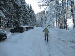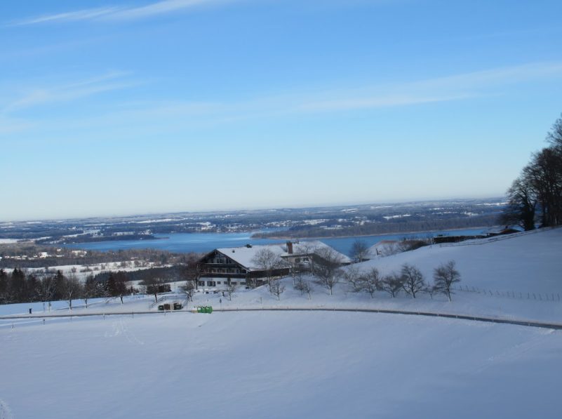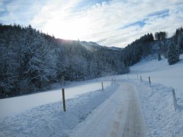 Nachdem es gestern den ganzen Tag leicht geschneit hat, schaut heute in Prien wieder einmal die Sonne vorbei. Für die nächsten Tage ist wieder schlechteres Wetter angesagt, also auf zum Langlaufen. In müsste es eigentlich jetzt genug Schnee haben, um zu spuren. Die Bernauer Internetseite meldet allerdings 0 cm Schnee und Loipen nicht gespurt. Das kann aber nicht sein, sicher wurde die Seite noch nicht aktualisiert. Ich fahre trotzdem rauf und komme in eine herrliche Winterlandschaft. Bis Hintergschwendt ist die Straße schneefrei, dann bis zum gut geräumten Wanderparkplatz  Aigen ist Schneefahrbahn.