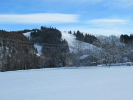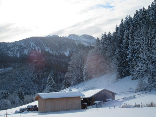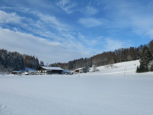 Zauberhafte Winterlandschaft in Hintergschwendt, aber Loipe noch nicht gespurt.