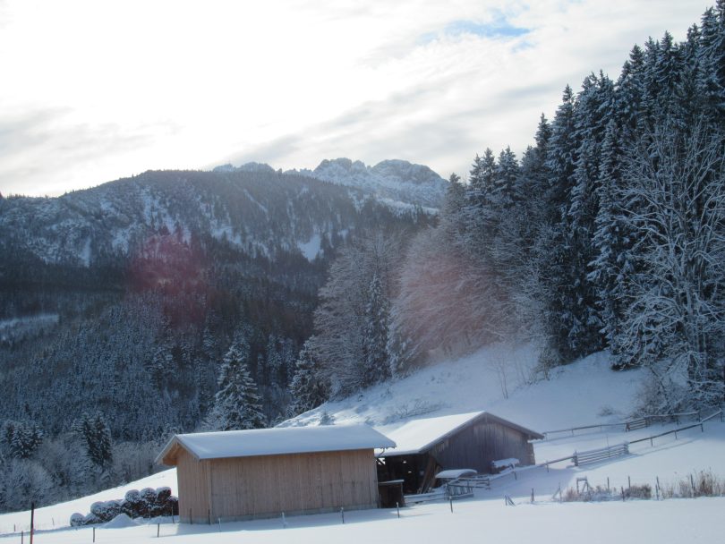 Ein paar Autos sind da – Skitourengeher, von denen die ersten schon wieder von der Steinlingalm herunterkommen. Die Loipe von Hintergschwendt nach Aigen ist aber leider noch nicht gespurt, die Wiese vor dem Anwesen Aigen glitzert unberührt in der Sonne. Es ist auch kein Spurgerät in Sicht, obwohl es schon gleich Mittag ist.