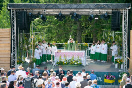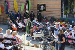 Pfr_Kreuz: Pfarrer Magnus König zelebrierte eingerahmt von den Ministranten und dem herrlichen Blumenschmuck den ZDF-Fernsehgottesdienst, der nur einmal im Jahr im Freien aufgezeichnet wird.