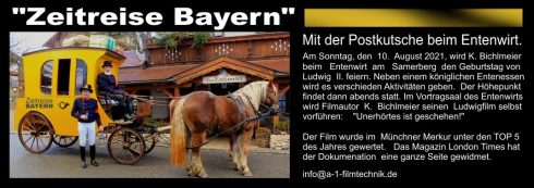 Am Sonntag, 10. August kommenden Jahres 2021 wird der Münchner Filmer Klaus Bichlmeier beim Entenwirt am Samerberg den Geburtstag von König Ludwig II feiern. Neben einem königlichen Entenessen wird es verschiedene Aktivitäten geben. Der Höhepunkt findet dann abends statt. Im Vortragssaal des Entenwirts wird Filmautor Klaus Bichlmeier seinen Ludwig-II-Film mit dem Titel “Unerhörtes ist geschehen” vorführen. Der Film wurde im Münchner Merkur unter den TOP 5 des Jahres gewertet. Das Magazin London Times hat dieser Dokumentation eine ganze Seite gewidmet.