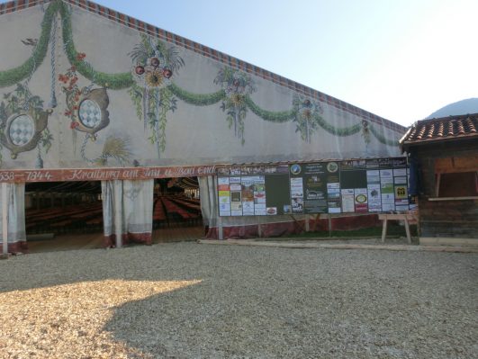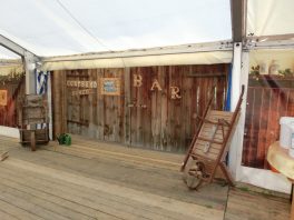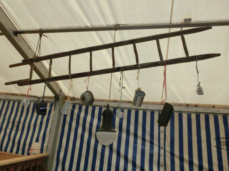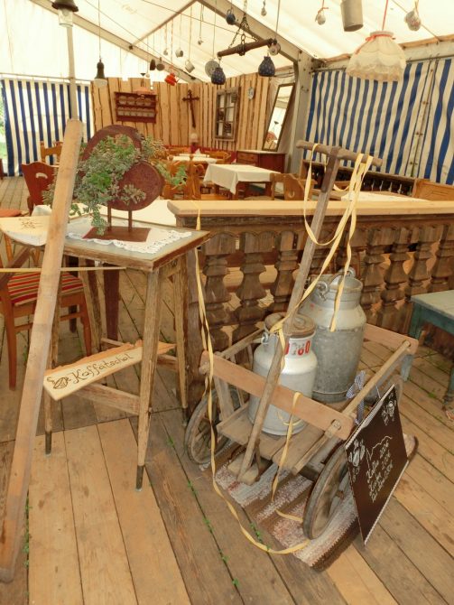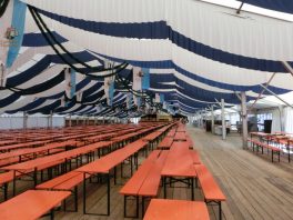 Da in Rottau die Bühne nicht das Zelt halbiert, muss auch für die ersten Veranstaltungen der später abzubauende Teil geschmückt und vor allem auch beleuchtet werden. Also nochmal rauf auf die hohe Leiter und die Kabeln verlegen, Lampen aufhängen. Es ist heiß und dampfig, denn gestern abend gabs einen gscheiden Regenguss. Das Zelt ist dicht. Küchenzelt, Kaffee- und Kuchenbereich und auch die noch wie ein Geheimnis gehütete Bar sind schon mit allem ausgestattet, der Biergarten im Freien und der Toilettenbereich sind mit Hackschnitzeln ausgestreut, Plakate, Preisschilder hängen….