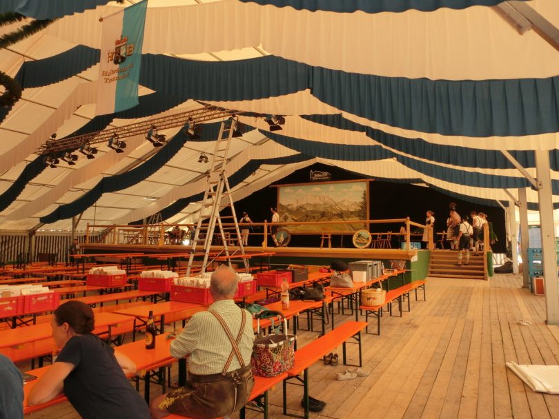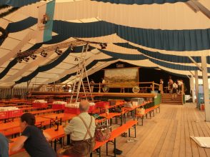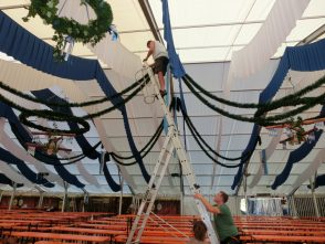 Das Zelt war schon eine Woche früher gekommen, über einhundert Helfer sind teilsweise seit zwei Wochen ständig am werkln. Und trotzdem, es gibt noch genug wichtige Kleinigkeiten zu erledigen. Heut war die Zeltabnahme, alles bestens, aber hier noch zwei Haken, die tiefer versenkt werden müssen, da noch ein paar zusätzliche Notausgangsschilder, die beim Aufbaun in irgendeiner Kiste verschwanden, das Gauzeichen und das Rottauer Vereinszeichen müssen noch aufgehängt werden. Morgen treffen sich die Frauen noch einmal zum Girlandenbinden. „Wir brauchen doch noch mehr, als gedacht“ stand in der Rund-Email, und schon werden die frischen Daxen geliefert, damit auch am Bühnengeländer noch was Grünes erfrischt.
