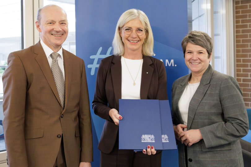 Bericht und Foto: StMAS / Nötel – Foto zeigt: Bayerns Sozialministerin Ulrike Scharf zusammen mit dem bisherigen Vizepräsidenten des ZBFS Alfred Zipfel-Zinn und seiner Nachfolgerin Kerstin Wimmer (r.).
