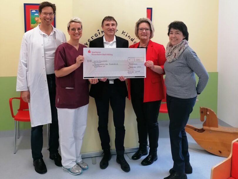 Eine erfreuliche Geste der Großzügigkeit erfuhr der Förderverein der RoMed Kinderklinik durch die spendenfreudige Hand der Firma Zosseder aus Eiselfing. Mit einem Scheck über 3.000 Euro unterstützt das Unternehmen erneut die wichtige Arbeit des Vereins, der sich unermüdlich für das Wohl der kleinen Patienten einsetzt. Die Vertreterinnen des Fördervereins Mihaela Hammer (2.v.r.), 1. Vorsitzende, und Helene Lohner (1.v.r.), Vorstandsmitglied, nahmen gemeinsam mit dem Leitenden Oberarzt Dr. Michael Buss (1.v.l.) und der stellvertretenden Stationsleitung Sylvia Geigenscheder (2.v.l.) die großzügige Spende vom Geschäftsführer der Zosseder GmbH Tiefbau, Dipl.-Ing. (FH) Oliver Lässing  (Mitte) entgegen. Die Firma Zosseder beweist damit abermals ihre Verbundenheit mit der Region und ihrem sozialen Engagement.