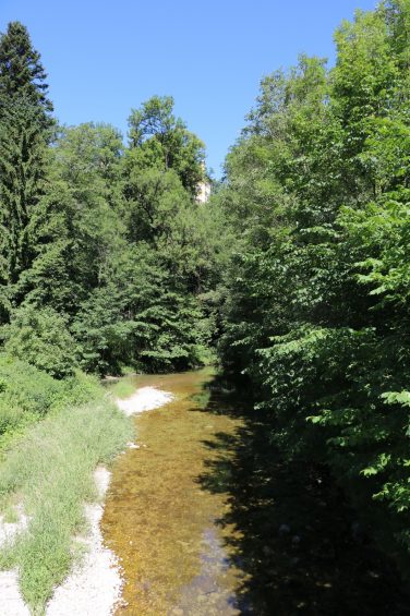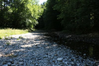 Tatsächlich – oberhalb des Wehres, das beim Schloss Wildenwart die gesamte Flussbreite der Prien absperrt und alles Wasser in den Mühlbach ableitet, war augenscheinlich genügend Wasser da, unterhalb des Wehres aber wachsen die Brennnesseln mannshoch im trockenen Flussbett. 400 Liter pro Sekunde müsse der E-Werkbetreiber ganzjährig im Fluss belassen, um eine Mindestbewässerung und ein Überleben der Flussbewohner sicherzustellen, forderte Johannes Schnell vehement vor den Kameras des Bayerischen Rundfunks. Es sei ein offenes Geheimnis, dass es oft Verstöße gegen diese gesetzlichen Mindestmengen gebe und alle Vorstöße des LFV bisher abgeschmettert worden seien.