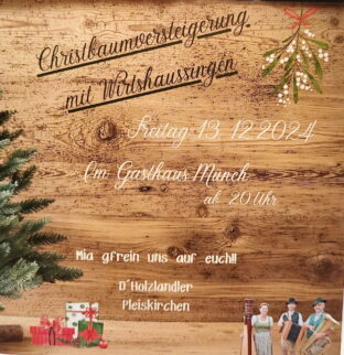 Der Trachtenverein D’Holzlandler Pleiskirchen/Lkrs. Altötting veranstaltet am kommenden Freitag, 13. Dezember um 20 Uhr im Gasthaus Münch eine Christbaumversteigerung mit Hoagascht und Wirtshaussingen. Das Besondere an diesem Brauchtumstermin ist das Angebot an zahlreichen selbstgefertigten Gegenständen, die vom “Versteigerer” Heinrich Zagler in bewährter humorvoller Weise angepriesen werden.