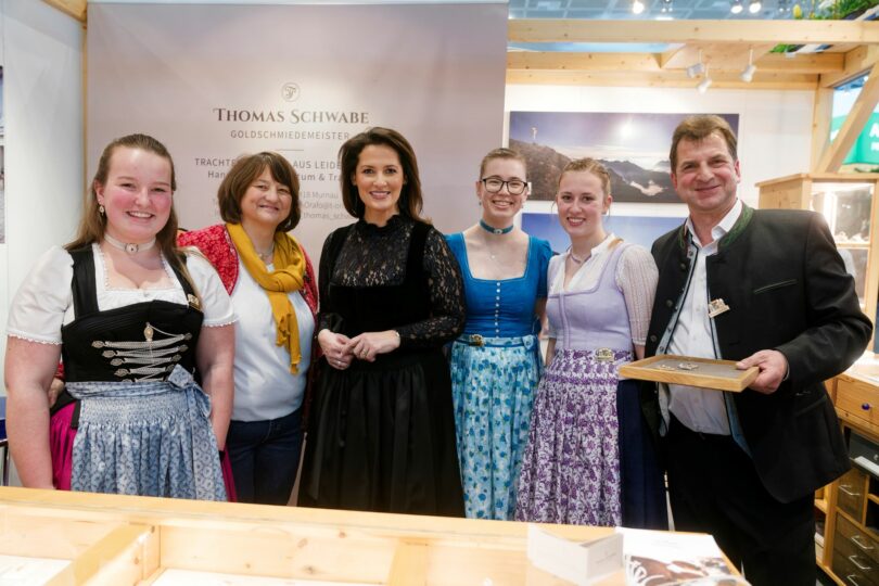 Foto: Tourismusministerin Michaela Kaniber gemeinsam mit dem Standpersonal der Goldschmiede Thomas Schwabe