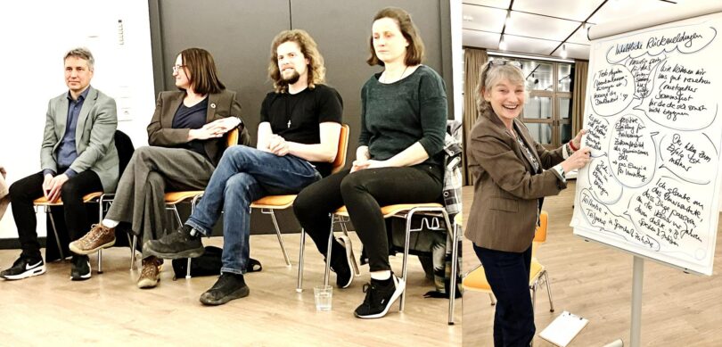 Das Gesprächsformat „Sprechen und Zuhören“ wurde vom Verein „Mehr Demokratie“ entwickelt, der vor über 30 Jahren in Bayern gegründet wurde und heute bundesweit mehr als 11.000 Mitglieder zählt. Moderatorinnen des Abends waren Kristina Henry und Barbara Leider aus München. Sie erklärten den Teilnehmenden das besondere Prinzip: In kleinen Gruppen spricht jede Person nacheinander vier Minuten über eine persönliche Frage zum Thema, ohne unterbrochen zu werden. Die anderen hören lediglich zu, ohne zu kommentieren oder zu bewerten.