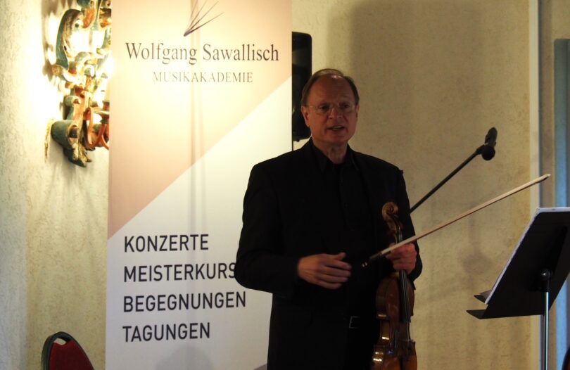 Im vollbesetzten großen Kammermusiksaal begrüßte der Stiftungsvorstand Paul Bischof die Gäste, Freunde und Förderer der Sawallisch-Stiftung zum letzten der diesjährigen vier Festkonzerte zu Ehren des Jubilars. In diesem Zusammenhang wies er darauf hin, dass die Wolfgang-Sawallisch-Stiftung mit den Geburtstagskonzerten auch die Erinnerung an den großen Dirigenten wachhalten möchte.Dafür hat sich der langjährige Konzertmeister Markus Wolf, welcher schon unter Prof. Sawallisch im Bayerischen Staatsorchester gespielt hat, die Mühe gemacht, ein Programm zusammenzustellen, das ganz im Zeichen des Jubilars stand, auch wenn es vermeintlich unerwartet drei Werke vom Beginn des 20. Jahrhunderts waren. Zum besseren Verständnis erläuterte er dann humorvoll während der Matinee die Zusammenhänge der Musikstücke mit dem Jubilar.