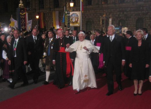 - Papst Benedikt XVI mit Kardinal Friedrich Wetter, Bundespräsident Köhler, Bundeskanzlerin Angela Merkel (etwas verdeckt) und Ministerpräsident Stoiber.