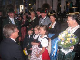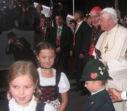 München/Chiemgau (hö) – Diesen Tag werden Sophie (9), Theresa (8) und Moritz (6) aus Unterwössen im Chiemgau ihr Lebtag wohl nicht vergessen. Zum Empfang von Papst Benedikt XVI in München überreichten sie diesem einen Blumenstrauß. Die drei Dufter-Kinder aus dem Achental waren Teil einer Delegation des Bayerischen Trachtenverbandes unter der Leitung ihres Opas Otto Dufter. Auf die Frage des Papstes, woher denn die Kinder kommen, antworteten sie diesem: „Aus Unterwössen“. Darauf der Papst: „Da war ich schon oft“ und er überreichte den Kindern einen Rosenkranz zum Dank für die Aufmerksamkeit.