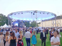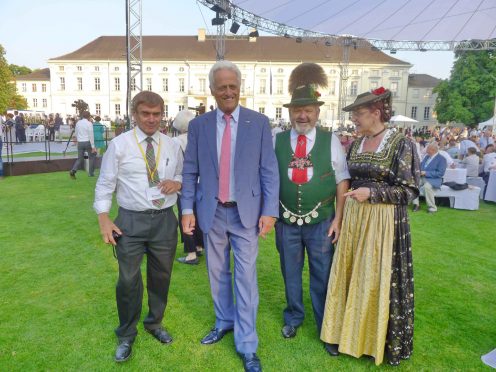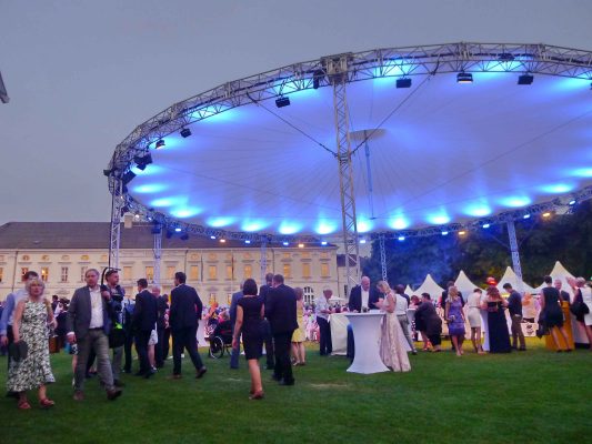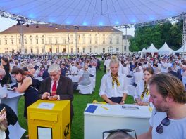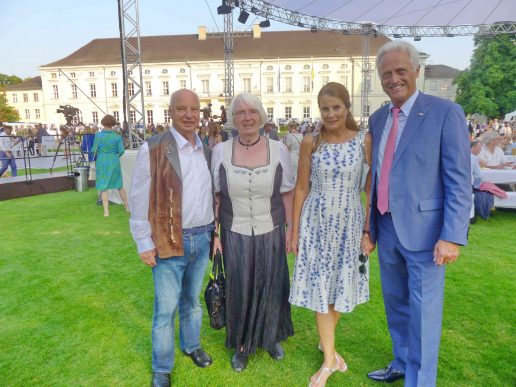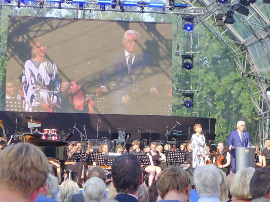 Sie glauben gar nicht, was das für ein toller Ausblick ist von hier vorne! Herzlich willkommen im Park von Schloss Bellevue! Herzlich willkommen in Berlin, dreißig Jahre nach dem Fall der Mauer! Willkommen in der Hauptstadt unseres vereinten Landes! Herzlich willkommen auf Ihrem Bürgerfest!