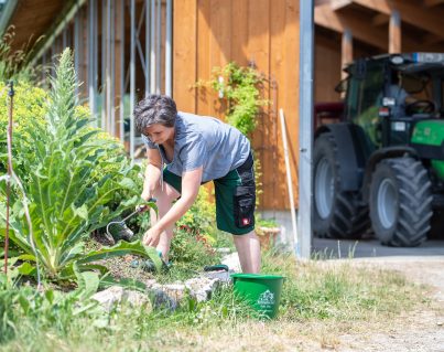 Als Arbeit empfindet die Bäuerin ihren großen Bauerngarten aber nicht. „Des mach ich einfach gern“, sagt sie. Gerade in unruhigen Zeiten wie diesen, „gartelt“ sie auch für die Seele. „Die im Bauerngarten anfallenden Aufgaben gehen der Floristin auch leicht von der Hand, weil sie seit eh und je dazugehören. „Viel hat mir mei Mama schon gezeigt“, erzählt Renate Mix. Schließlich ist sie mit diesem Garten aufgewachsen. 2013 hat die gelernte Floristin mit ihrem Mann Christian den Hof von ihren Eltern übernommen. Während manche Pflanzen wie die purpurfarbene, vier Meter hohe Weigelie mitten im Garten alle Zeiten überdauert, gibt es Dinge, die geändert werden müssen, um weiter bestehen zu können: So wie der Stall für die mittlerweile 43 Kühe der Bauernfamilie. „Der alte Stall war baufällig und wir mussten entscheiden, ob wir mit der Milchwirtschaft aufhören oder weitermachen“, erinnert sich Christian Mix. Sie haben sich gemeinsam als Familie fürs Weitermachen und für den Neubau eines Laufstalls entscheiden. In enger Abstimmung mit der Molkerei Berchtesgadener Land, an die sie seit dem Stallneubau 2019 ihre Milch liefern, haben sie einen modernen Laufstall mit viel Licht, Luft und Bewegung für ihre Kühe gebaut. „Für mehr Tierwohl und für eine Zukunft für die Jugend“, betont Christian. Korbinian, der älteste der drei Söhne, besucht derzeit die Landwirtschaftsschule und will später den Hof übernehmen. „Beim Garten helf‘ ich ihm dann schon noch“, sagt Renate mit einem Augenzwinkern. Schließlich gibt es auf einem Bauernhof genug Arbeit für alle Generationen.