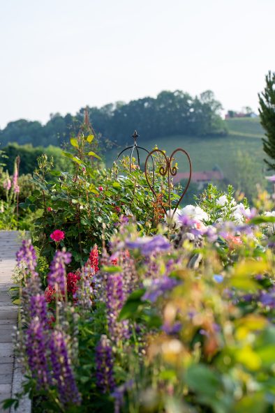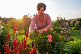 Die ersten goldenen Sonnenstrahlen im Rücken arbeitet sich Renate Mix von den apricotfarbenen Rosen zu den roten Lupinen vor. Die 45-Jährige zwickt das Verblühte an den über ein Meter hohen Blütenkerzen ab und wirft es in eine Zinkwanne, die sie sich neben das Beet gestellt hat. Langsam erreichen die wärmenden Sonnenstrahlen das Bauernhaus mit den Holzbalkonen, den grünen Fens-terläden und den roten Geranien. „Ohne Fleiß kein Preis“ ist in der Mitte des ersten Balkons eingeschnitzt und prangt so über der Haustür, die die Bäuerin der Molkerei Berchtesgadener Land bei ihrer frühmorgendlichen Gartenarbeit im Blick hat. Üppig blühen pinke Rosen, lila Akeleien, rosa-weißer Phlox und lilablaue Glockenblumen. Dunkelgrüne Funkien harmonisieren das prächtige Farb-spiel. Die zwei Staudenbeete zieren fast die gesamte Hauslänge entlang der Terrasse vor dem Bauernhaus. Und doch bilden sie nur einen Teil des bunten Blütenmeers am auf 600 Höhenmeter gelegenen „Buchnahof“.
