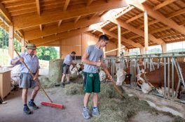 Das tun auch die beiden Laufenten der Familie Mix. Der Senior Hans lässt die beiden aus dem Stall, die erst zögernd dann laut quakend loswatscheln. Renates Vater geht derweil weiter zum zweiten kleinen Stall, der hinter einem – natürlich üppig bepflanzten – Gartenhäuschen mit modernen Lounge Möbeln versteckt ist. Dort füttert er die 14 Hühner. In den beiden großen Ställen für die Kühe und Pferde war er heute schon: Die zwei Kaltblüter hat er frühmorgens auf die Weide gebracht und anschließend seinem Schwiegersohn und seinem Enkel bei der Stallarbeit geholfen. Drei Generationen auf einem Hof und in einem Stall – ein typisches Bild für die Landwirtschaft im Alpenraum. So holt die Molkerei Berchtesgadener Land die Milch von insgesamt 1.800 familiengeführten Bauernhöfen zwischen Watzmann und Zugspitze ab.