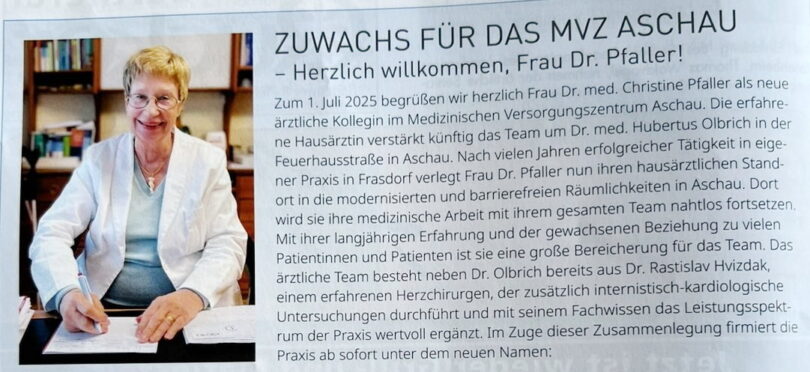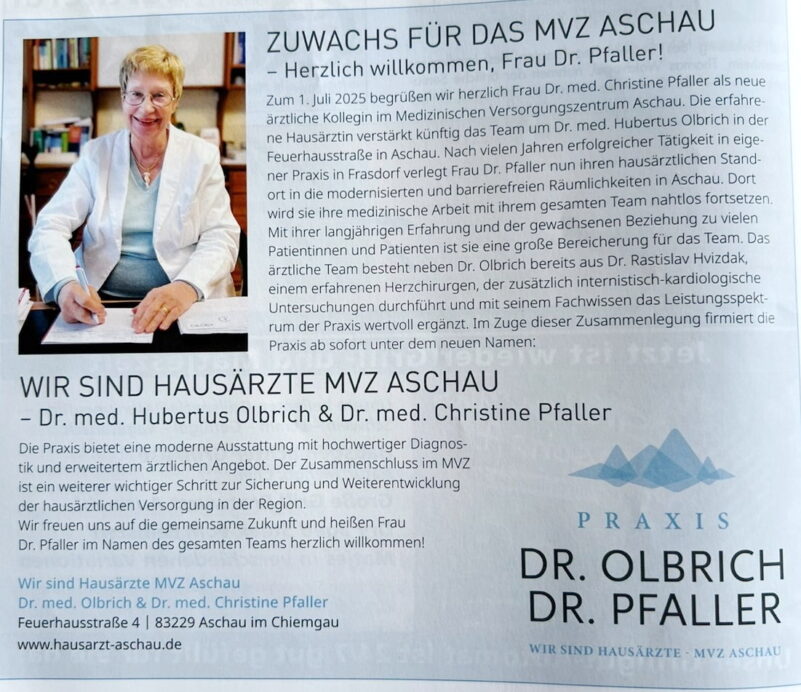 Das Medizinische Versorgungszentrum in der Gemeinde Aschau i. Chiemgau hat Verstärkung erhalten: zum 1. Juli 2025 konnte Frau Dr. med. Christine Pfaller als neue ärztliche Kollegin begrüßt werden.