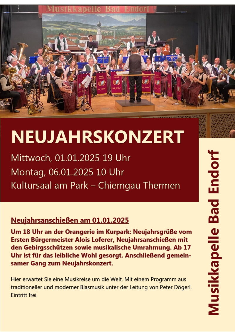 Die Musikkapelle und die Marktgemeinde Bad Endorf laden zu zwei Neujahrskonzerten im Kultursaal am Park bei den Chiemgau Thermen ein.