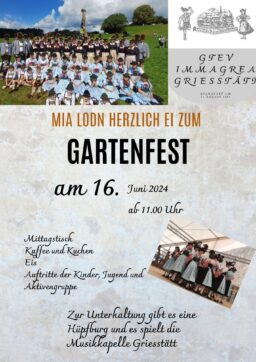 Am Sonntag 16. Juni findet wieder das traditionelle Gartenfest des Trachtenvereins “Immagrea” Griesstätt im Eckergarten statt. Warme Küche gibt es ab 11:00. Mit leckeren Gerichten vom Grill und aus der Pfanne sowie süffigen Bier und anderen Getränken ist für das laibliche Wohl bestens gesorgt. Für die gute musikalische Unterhaltung wird wieder die Musikkapelle Griesstätt sorgen. Die Trachtenkinder – und jugend haben fleißig geprobt und freuen sich a schon auf ihre Auftritte. Im Anschluss werden uns die Aktiven ihr Können zeigen. Für die Kinder gibt es eine Hüpfburg und viel Platz zum Spielen im Eckergarten.