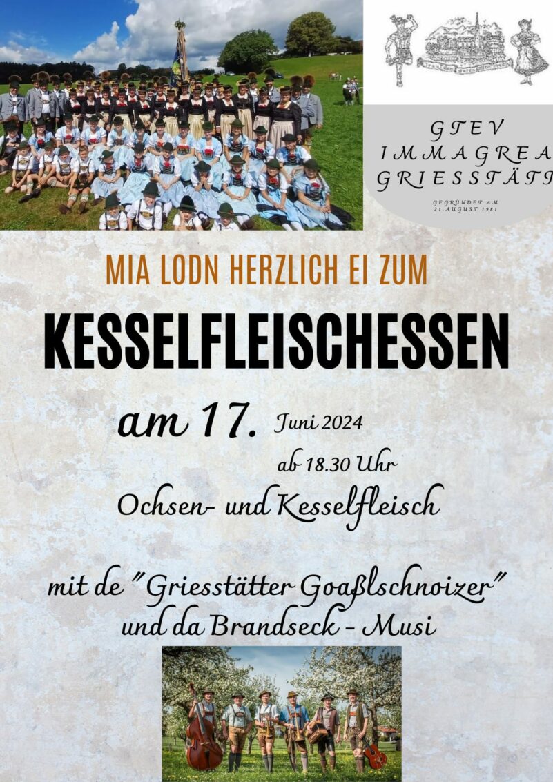 Am Montagabend, 17. Juni, rundet ab 18:30 Uhr ein Kessel- und Ochsenfleischessen das diesjährige Gartenfest ab. Hier spuit die „Brandseck-Muse“ zünftig auf und wie immer werden es die Griesstätter Goaßlschnoizer gscheid schnoizn lassen! Sowohl für Regen- als auch Sonnenschutz wird es auch ein Zelt geben. Der Trachtenverein Griesstätt gfreid se scho recht auf dieses alljährliche schöne 2-tägige Fest unter dem Motto „Gemeinsam feiern, s‘ scheene Brauchtum pflegen und gmiatlich zsamma kemma“.