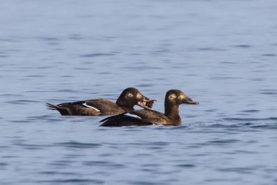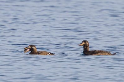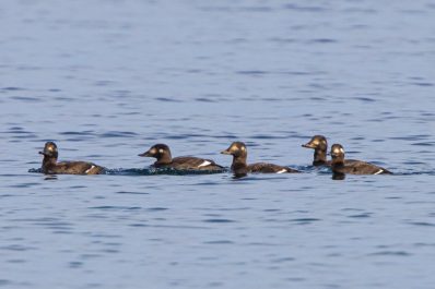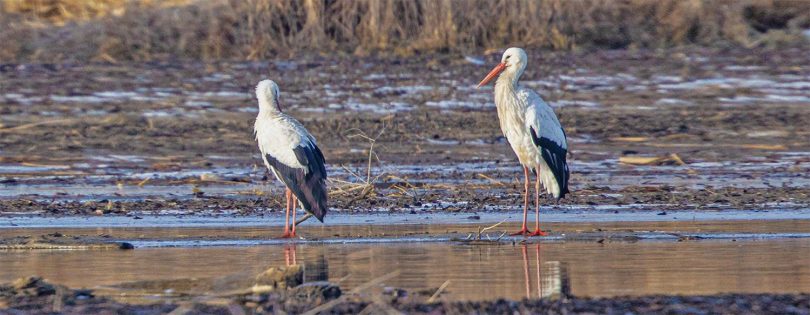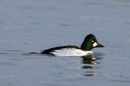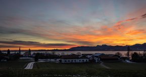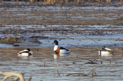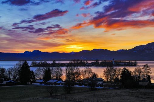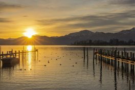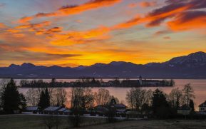 Ich nutzte den Neujahrsmorgen, um auf leeren Straßen entspannt zum Chiemsee zu fahren. In den Dörfern und auf der Fraueninsel brannte noch kein Licht, als ein fantastisches Morgenrot den See und das Alpenpanorama in fotogenes Licht tauchte. Außer einer Fotografin war kein Mensch am Strand bei Gstadt, um den herrlichen Sonnenaufgang zu genießen. Wegen der sich schließenden Eisdecke und dem niedrigen Wasserstand hatten die meisten Wasservögel den Irschner Winkel verlassen und versammelten sich in der Feldwieser Bucht. Nur noch zwei Weißstörche, einige Grau- und Silberreiher und vier Brandgänse verbrachten meist schlafend den Morgen auf den eisfreien Schlammbänken. Am Bootshafen in der Feldwieser Bucht konnten Samtenten beobachtet werden, die immer wieder tauchend kleine Pakete von Dreikantmuscheln an die Oberfläche brachten und verzehrten. Einige Spieß- und Schellenten waren schöne Fotomotive, die sich allerdings weiter auf den See zurückzogen, als ein unerschrockener Badegast für kurz Zeit seine Runden im See drehte.