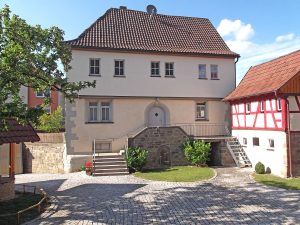 Brebersdorf in der Gemeinde Wassserlosen, Landkreis Schweinfurt. Das denkmalgeschützte Pfarrhaus mit Nebengebäude und Scheune wurde saniert und ist nun Wohnraum für den Pfarrvikar. Die Scheune nutzt die Dorfgemeinschaft für Feierlichkeiten.