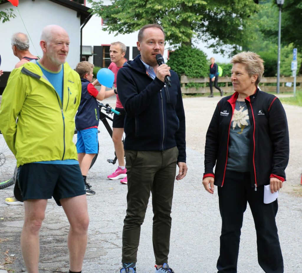Der Schirmherr des zweiten Aschauer Bankerllaufes Herbert Reiter (Mitte) mit dem zweiten Bürgermeister der Gemeinde Aschau Michael Andrelang (links) und der Organisatorin des Laufs Christine Heckel vom Lauffeuer Chiemgau.