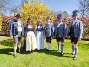 Gemeinsam starten sie in den Trachtensommer 2018 von links: 2. Vorstand Andreas Schmid und 1. Vorständin Liesi Hilger aus Rottau, Geschäftsführerin Christina Pfaffinger vom Tourismusverband Chiemsee-Alpenland, Sepp Brem, Festleiter beim Trachtenverein Lauterbach, Vorstand Ludwig Redl und Festleiter Klaus Gschwendtner vom Trachtenverein Prutting. Foto: Hötzelsperger