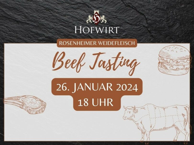 Am 26. Januar 2024 findet das zweite Beef Tasting beim Hofwirt in Neubeuern statt. Es gibt ein 6-Gänge Menü aus lokalen Bio-Rindfleischspezialitäten vom Rosenheimer Weidefleisch. Jeder Gang wird mit ganz viel Hofwirt-Liebe aus einem anderen Teil des Rindes zubereitet.
